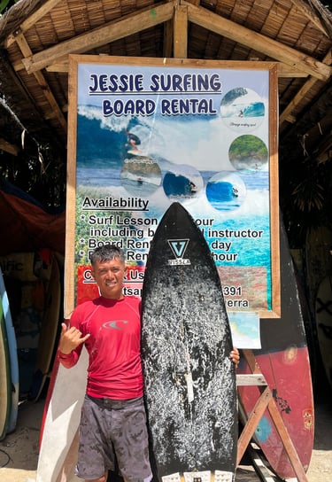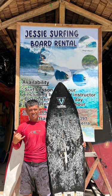 Jessie Noguerra, a Siargao local with 22 years of surfing experience, spent over a decade competing before dedicating the past six years to full-time surf instruction. Together with his experienced team, he guides first-timers to intermediates, offering essential training and continuous feedback to help you improve with confidence.