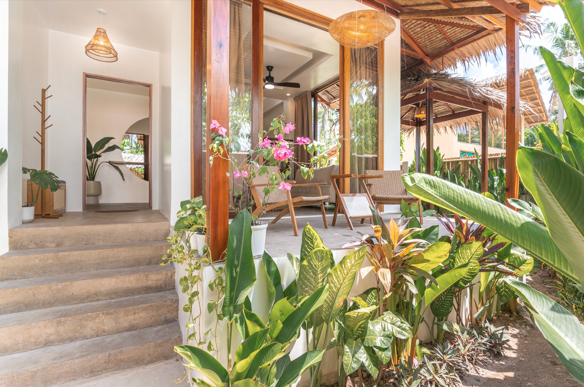 Spacious and serene with calming coconut forest views and gentle morning light.
