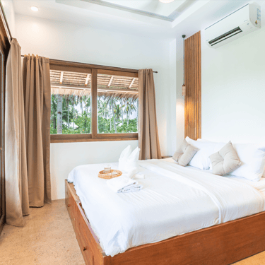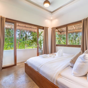 Spacious and serene with calming coconut forest views and gentle morning light.